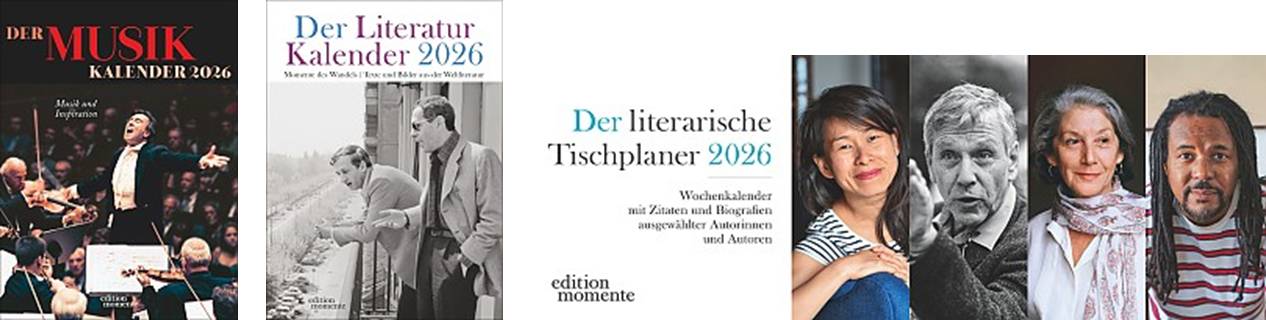 Nicht nur in Küche und Literatur, auch in der Musik leitet die edition momente ihre Leser durchs Jahr. Für 2026 hat Herausgeberin Melanie Unseld das Thema »Musik und Inspiration« eingefangen. Wie immer gibt es zahlreiche Portraits von Komponisten, Dirigenten, Pianistinnen und anderen Musikschaffenden, die in Bild und Wort, mal aus Briefen, in zitierten Aussagen oder Erinnerungen Dritter, in Erinnerung gerufen werden. Wir »erleben« Ermanno Wolf-Ferrari am Klavier, lesen einen Eintrag Clara Schumanns im Ehetagebuch, der Titel zeigt Claudio Abbado – vielleicht mit dem Schlußakkord? – in einer befreiten, glücklichen Pose des Dirigierens.