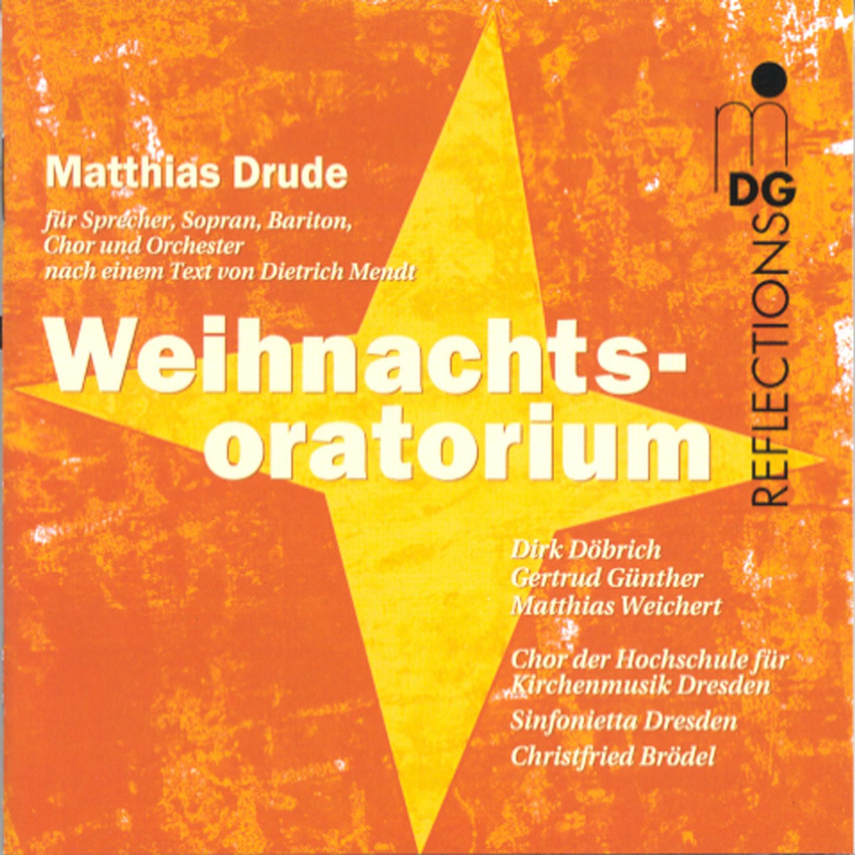 Matthias Drude hatte beim damaligen Direktor der Hochschule für Kirchenmusik Dresden offene Ohren für seine Idee gefunden, es sollte sein erstes großes, oratorisches Werk werden. Dabei legt Johann Sebastian Bachs gigantischer »Wurf« einen großen Schatten auf alle anderen Gattungsbeiträge. Selbst Heinrich Schütz oder Camille Saint-Saëns sind im Vergleich deutlich weniger präsent. Für Matthias Drude stand fest, daß er ein klar zeitgenössisches Werk schreiben wollte, das aber traditionelle Weihnachtsmusik, gerade durch Choräle, einschließen sollte. Weil er die Rolle des Evangelisten etwas gekünstelt fand, aber auch zur Abgrenzung von Bach, entschied er sich, auf einen Evangelisten zu verzichten. Dafür gibt es einen Sprecher als Erzähler sowie rezitativische Passagen der Beteiligten.