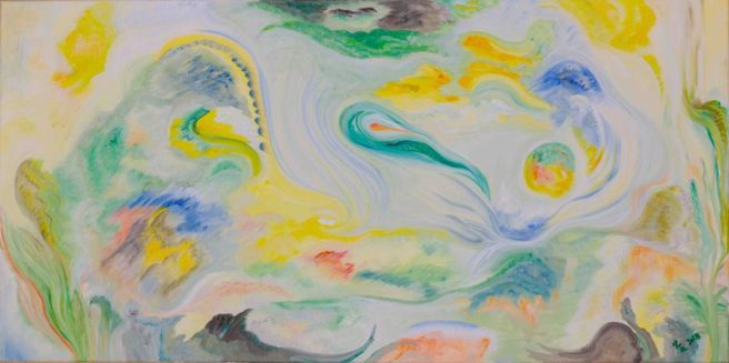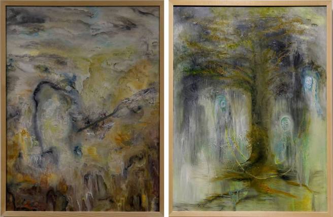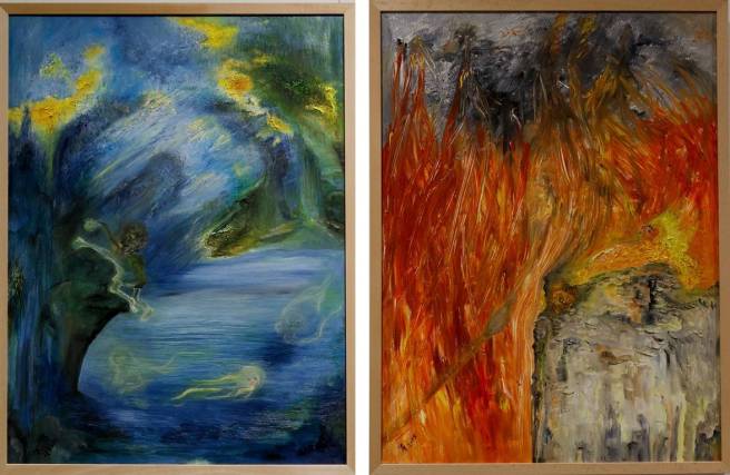 Richtig – Wagner und das jüdische Alphabet in einem Atemzug, in einem Kontext der künstlerischen Auseinandersetzung. Denn trotz der antisemitischen Äußerungen von Richard Wagner darf man beides hinterfragen, nicht nur Schranken errichten und starre Grenzen hüten. Im Künstlerhaushalt von Lieselotte Theil-Hurshell und Michael Hurshell ist dies offenbar nicht nur möglich, sondern führt zu einem fruchtbaren Austausch. Michael Hurshell, Leiter der Neuen Jüdischen Kammerphilharmonie Dresden, hat schon vor Jahren die Dauerausstellung der Wagnerstätten Graupa mit kuratiert. Übrigens ist Wagner nicht der einzige Komponist, auf den sich Lieselotte Theil-Hurshell bezogen hat: auch ein Bild zu Hector Berlioz‘ Symphonie fantastique ist zu sehen.