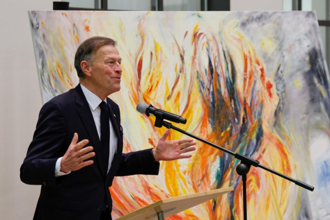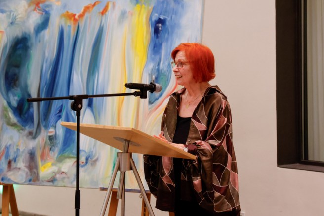 »Zeichen – Töne – Gestein« zeigt eine ganze Bandbreite von Zeichnungen und Gemälden der letzten drei Jahrzehnte. Der Einladung zur Eröffnung folgten so viele Besucher, daß die Vernissage nicht – wie sonst üblich – in oder vor den Ausstellungsräumen stattfand, sondern in die Caféteria des Landtages verlegt wurde.
