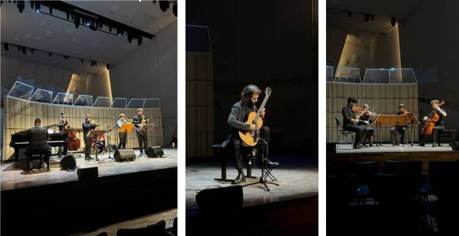 Der Ensemblewettbewerb bzw. die daraus hervorgehenden Preise sind neben den Deutschlandstipendien die größten finanziellen Förderprojekte an der HfM. Insofern gab es vor den nächsten Preisträgern einen Gastauftritt von Ozan Coşkun, der den Preis des Deutschen Akademischen Austauschdienstes (DAAD-Preis 2025, 1.000 Euro) erhielt. Der Gitarrist verband zwei Werke, ein eigenes Stück (Prelude pro Rapha) und eine arrangierte Komposition von Yamandu Costa (Samba pro Rapha), die den brasilianischen Gitarristen Raphael Rabello gewidmet sind. Auch diese charmante Plauderei mit ihrem lebhaften Dialog der Melodie in den Obertönen und dem begleitenden Baß hätte ohne Mikrophon noch zauberhafter wirken können!