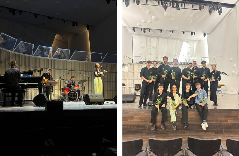 Der Ensemblewettbewerb bzw. die daraus hervorgehenden Preise sind neben den Deutschlandstipendien die größten finanziellen Förderprojekte an der HfM. Insofern gab es vor den nächsten Preisträgern einen Gastauftritt von Ozan Coşkun, der den Preis des Deutschen Akademischen Austauschdienstes (DAAD-Preis 2025, 1.000 Euro) erhielt. Der Gitarrist verband zwei Werke, ein eigenes Stück (Prelude pro Rapha) und eine arrangierte Komposition von Yamandu Costa (Samba pro Rapha), die den brasilianischen Gitarristen Raphael Rabello gewidmet sind. Auch diese charmante Plauderei mit ihrem lebhaften Dialog der Melodie in den Obertönen und dem begleitenden Baß hätte ohne Mikrophon noch zauberhafter wirken können!