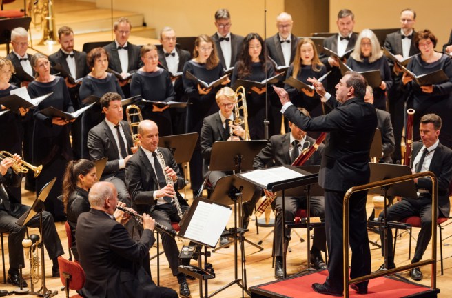 Verblüffend war vor allem, wie sacht Daniele Gatti den großen Sächsischen Staatsopernchor Dresden wirken ließ – wir haben die Mass durchaus schon mit deutlich kleineren (Kammer)chören sehr viel expressiver erlebt! Doch die Expressivität fehlte hier keineswegs, entstand vielmehr im Verlauf und arbeitet so Aussagen, als würden sie unterstrichen, stärker heraus. Gerade im dritten Teil (Credo) fielen solche Kontrastunterschiede zwischen sanftem Piano und betontem Forte auf. Das Sanctus wurde von einem spürbaren Anstoß getragen (nicht nur ausgelöst), während der Chor im Agnus Dei in einer quasi-a-cappella-Passage hervortrat. Eine Geschlossenheit und feine Konturierung lag Daniele Gatti ganz offenbar am Herzen, was auch durch die aus dem Chor wirkenden Solisten (Eunjung Kwak (Sopran), Brynne MacLeod (Alt), Alexander Schafft (Tenor) und Holger Steinert (Baß) unterstrichen wurde.