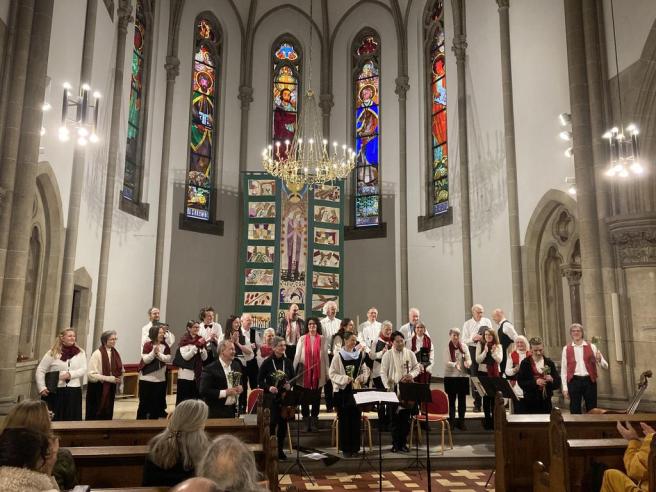 Mit einem Engelsgesang (Sanctus) von Guillaume Dufay, Thomas Tallis‘ »Hear the voice and prayer« (Gebet) und einem Chor zum Thema Tod aus der Begräbnismusik für Queen Mary von Henry Purcell begab sich SINGularis in die Zeit zwischen 15. und 17. Jahrhundert bzw. der Renaissance. Während das schlichte, aber harmonisch und rhythmisch ungewöhnliche Sanctus von Dufay eine Herausforderung war, erweckte Thomas Tallis‘ Gebet bereits einen sehr geschlossenen Eindruck. Bei Henry Purcell war die Begräbnismusik um die festlichen Instrumentalstimmen bereichert und die Betonung lebhaft gestaltet. »Yet o Lord« (Doch, oh mächtigster Herr) trat als Anrede und Ausruf, verbunden mit einer Bitte, deutlich hervor.