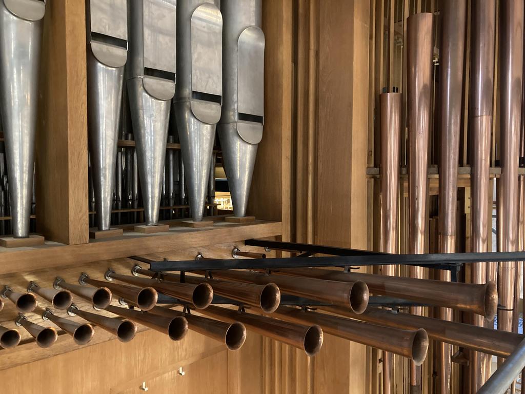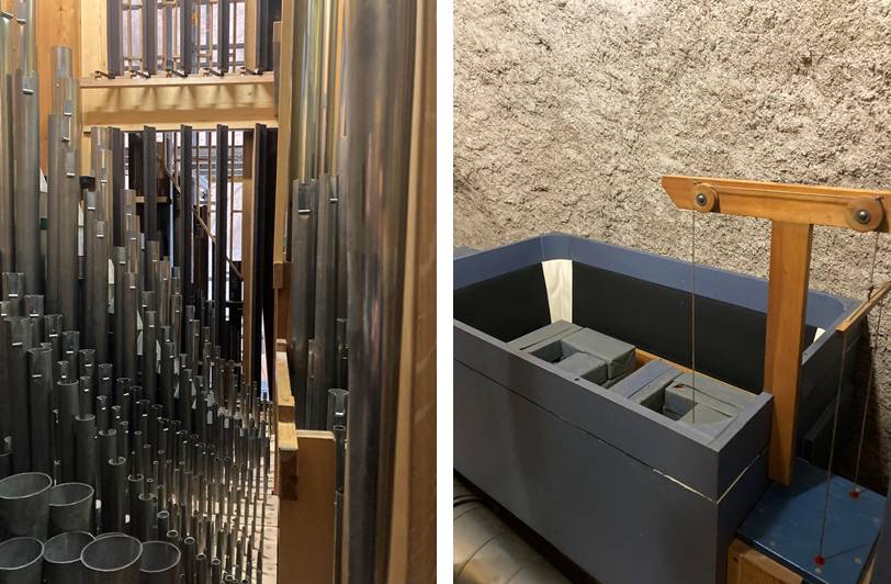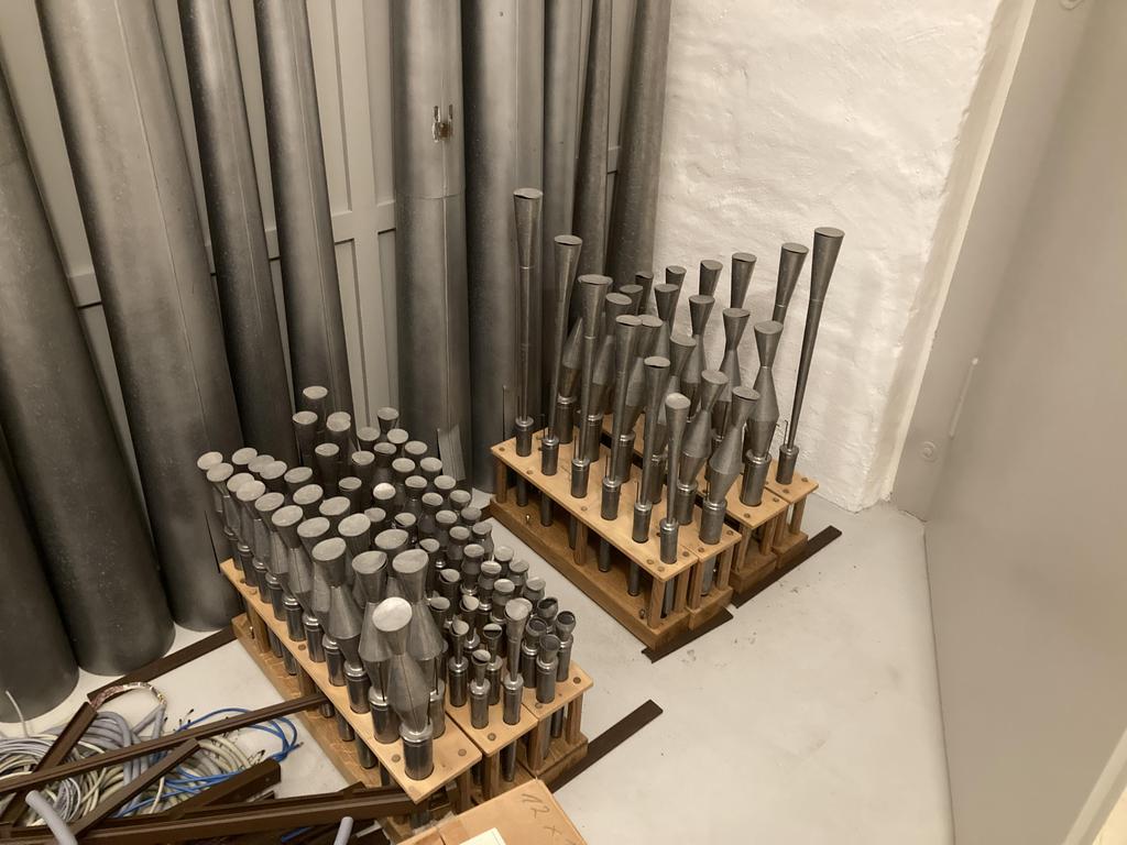 Derzeit sieht es in der Orgel aus wie in einer Werkstatt, was sie ja auch ist: ausgebaute Orgelpfeifen, Werkzeuge, Werkbänke, überall wird gearbeitet. Beim Reinigen wurde vor allem eine dicke Schicht Staub beseitigt, Funde wie in Pfeifen gefallene Tiere oder ähnliches gab es nicht.