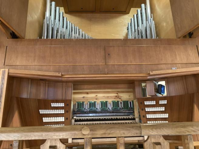 Schon vor Jahrzehnten wurden Orgeln mit einem Rechner oder Speicher verbunden. Die Jehmlich-Orgel hatte 999 Plätze auf dem sogenannten Setzer, auf denen Registerkombinationen programmiert werden konnten. Das wird nun deutlich mehr, vor allem können sie wieder geschützt werden, so daß ein Spieler nicht versehentlich die Vorbereitung eines anderen löscht. Eine MIDI-Schnittstelle wird es erlauben, die Orgel mit elektronischen Instrumenten zu verbinden, über eine App ist es einer Person dann auch möglich, die Intonation allein einzurichten. Man kann also künftig auf einen »Tastenhalter« verzichten und mit Hörabstand im Raum arbeiten. Außerdem kann Musik, etwa Improvisationen, direkt auf einen Rechner übertragen werden – es gibt mittlerweile Apps, die gleich die entsprechenden Noten aufschreiben.