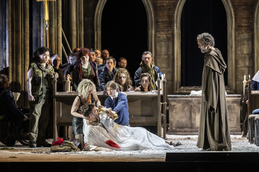 Neben der Schulklasse besuchen Versehrte die Abtei und deren Heilige Quelle, als wäre es Lourdes. Da tauchen plötzlich Figuren auf, ein Ritter in chromglänzender Rüstung (Kostüme: Jon Morell), und Parsifals Geschichte bildet sich in der Realität des Jungen ab. Die erfundene, stumme Rolle war vielleicht das tollste an diesem Abend, denn Leander Wilde spielte fast die ganze Zeit mit, war nicht nur nah dran, sondern griff ein, gab Ermatteten Wasser aus seiner Trinkflasche, versucht zu schlichten, zu trösten – und durfte es doch nicht. Der Junge ist ein wenig wie ein Zeitreisender, der in der Geschichte rückwärts geht, vergangene Geschehnisse erlebt, aber nicht eingreifen darf, weil er sonst seine Gegenwart verändert. Für sein anspruchsvolles Spiel wurde Leander Wilde am Ende zu Recht gefeiert, war zweiter Held neben Parsifal.