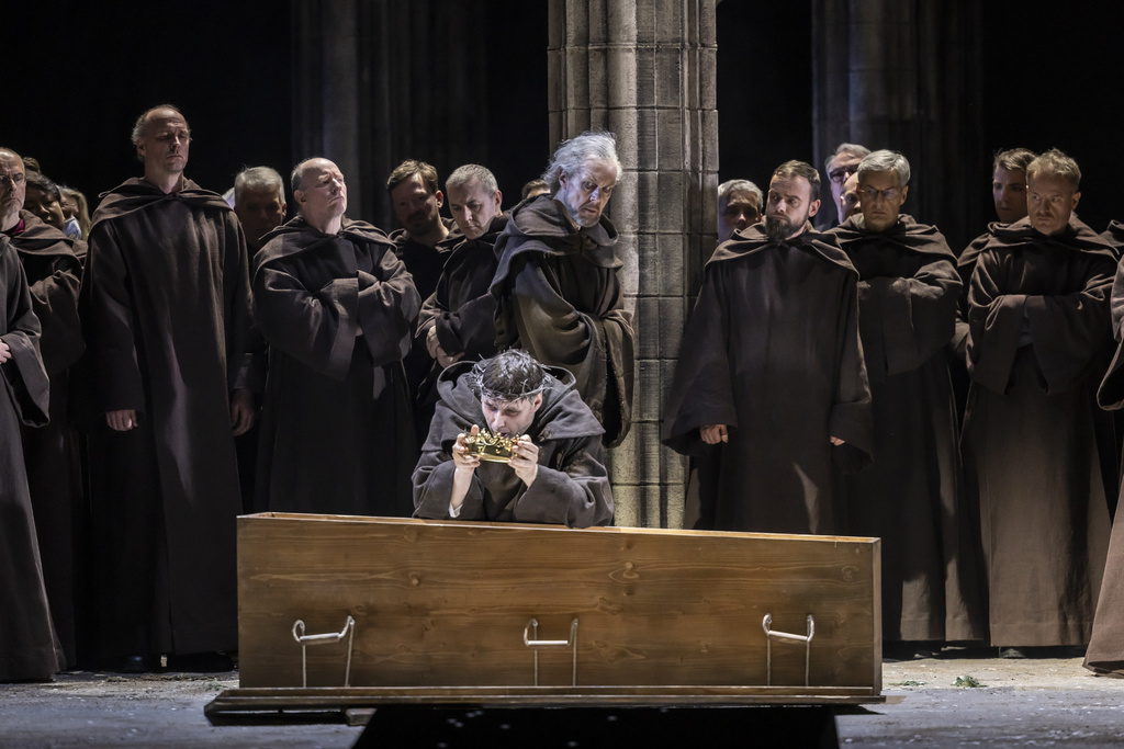 Die Regie tat nichts dafür, ein Bild zu fügen, im Gegenteil, zerfiel die Szene regelrecht. Der Kinderchor der Semperoper Dresden, für sich genommen toll vorbereitet, klang im ersten Aufzug von weit rechts, irgendwo draußen, wie auch die Frauen (links). Und selbst die Männerstimmen, wiewohl mittig hinten, litten am »Außeneindruck«. Die Stimme von oben? Irgendwoher. Vielleicht zerfiel hier gar nichts, sondern hatte sich gar nicht gefügt!