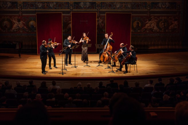 Die größere Verblüffung gab es aber wohl mit dem folgenden Stück, obwohl wenn man Mozarts Sinfonia concertante Es-Dur (KV 364) an sich kennt. Das beliebte Werk steht gern auf dem Plan, wenn sich zwei Virtuosen mit Violine und Viola vor einem Orchester treffen. Das Grande sestetto concertante für Streichsextett und Kontrabaß ad libitum war die Bearbeitung eines unbekannten Zeitgenossen Mozarts. Damals war dies eine übliche Praxis für den Markt der Massenware: Musiker, manchmal weniger begabte Komponisten, fertigten Fassungen großer Werke für den Hausgebrauch an. Manches darunter ist von höchster Qualität (Johann Nepomuk Hummel, wiewohl kein »minderer« Komponist, bearbeitete Mozart für Flötenquartett), und auch das Grande sestetto concertante bezauberte nicht nur, es erreichte neben dem Originalwerk Eigenständigkeit. Die konzertierenden Stimmen sind oft auf je zwei Instrumente übertragen (neben Tibor Gyenge und Michail Kanatidis Sebastian Herberg und Anya Dambeck an den Violen), das erste Violoncello (Sebastian Fritsch) trat solistisch stärker hervor. Trotzdem blieben die Solostimmen dezent eingebunden, wobei das ad libitum zum Septett gewachsene Ensemble nicht nur durch den Kontrabaß (Andreas Ehelebe) dramatische Verläufe geschmackvoll herausarbeiten konnte – diese exquisite Darstellung war ein Höhepunkt!