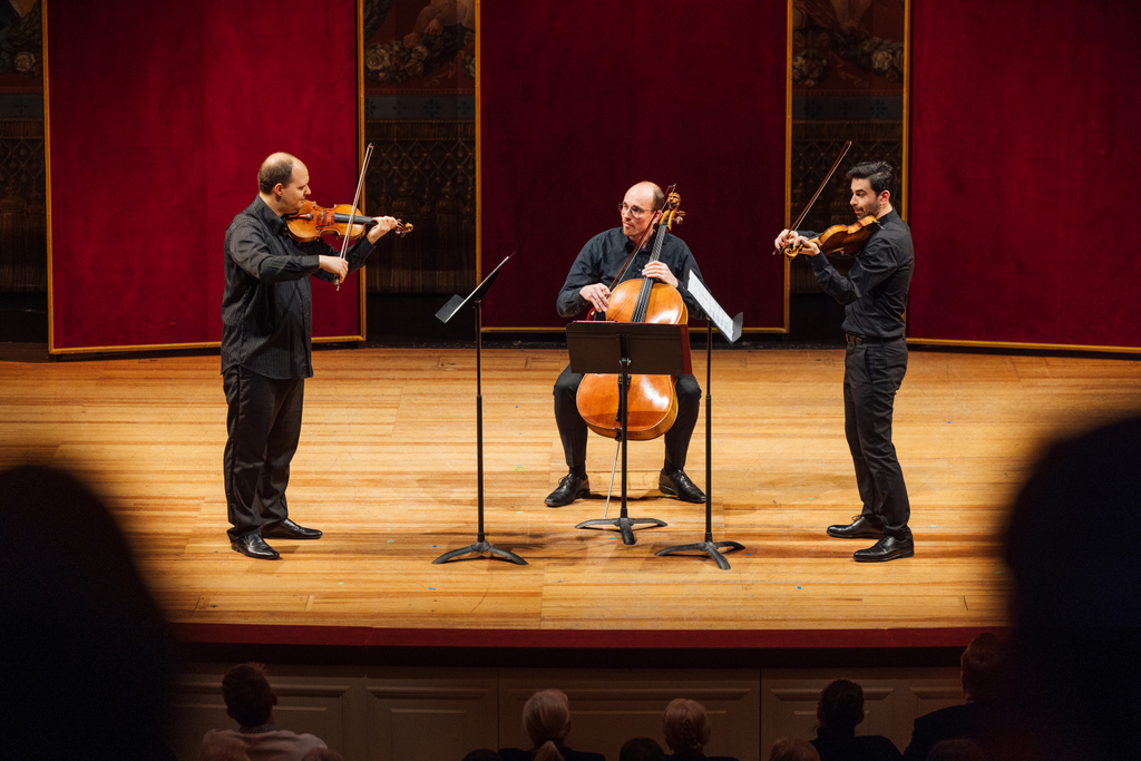 Wolfgang Amadé Mozarts Serenade »Ganz kleine Nachtmusik« (KV 648), vor zwei Jahren erst in der Musikabteilung der Leipziger Stadtbibliothek wiedergefunden, erklang, vermuteten die Musiker, in Dresden vielleicht das erste Mal überhaupt in einem Konzert, zumindest seit der Wiederentdeckung*. Tibor Gyenge und Michail Kanatidis (Violinen) sowie Titus Maack (Violoncello) spielten das Streichtrio des jugendlichen Mozart – eine mit seinen beiden hohen und der einen tiefen Stimme gegenüber dem normalen Streichtrio (Violine, Viola, Cello) »verschobenen« Besetzung. Doch schon beim Teenager (wenn nicht früher) Mozart zeigten sich Witz und Charme, die Gediegenheit des Miteinanders wie kommentierende Stimmen, die an Haydn erinnerten (Menuet) und humorvolle Passagen, die mit Flageolett und anderen Verfremdungen spielten. Das schien einmal sogar zu Luigi Boccherini zu führen, denn im Adagio, mit Dämpfern gespielt, ähnelte Mozarts Duktus dem dunklen Ton des Italieners. Mit dem flotten Kehraus des Finale. Allegro war die »Ganz kleine Nachtmusik« schon vorbei – sicher wird man nicht lang auf eine Wiederaufführung warten müssen.