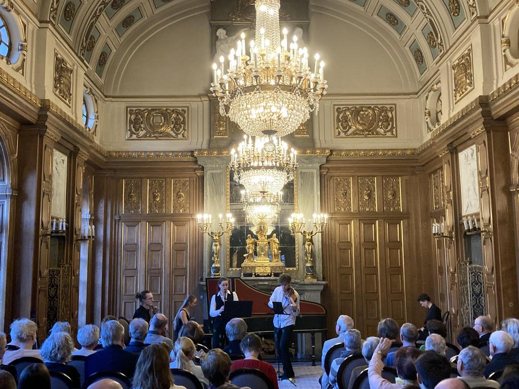 Anna Mazáčková (Traversflöte und Leitung), Hana Kohout (Blockflöte), Filip Zaykov (Barockvioline), Lukáš Hrnčárek Barockvioloncello) und Markéta Vepřeková (Cembalo) spielten vor allem in den führenden Melodiestimmen in wechselnder Besetzung und begannen eine Generation vor Mozart bei Carl Philipp Emanuel Bach. »Er ist der Vater, wir sind die Buben« hatte Wolfgang Amadé anerkennend über den fortschrittlichsten der Bach-Söhne gesagt. Die Triosonate d-Moll (H. 569 / Wq 145) war nicht nur ein Beispiel der Gattung, die an diesem Abend schöne Blüten vorzeigte, es sorgte mit den luftigen Stimmen von Flöte und Violine, wobei ersterer die größeren Höhen zugestanden blieben, für eine musikalische Erfrischung im Blauen Saal des Schlosses. Sich spiegelnde Melodieverläufe paßten zu dessen Inneneinrichtung, die Gelassenheit des Ausdrucks und elegant bemäntelte Virtuosität (Flöte) standen für die Epoche der empfindsamen Musik.